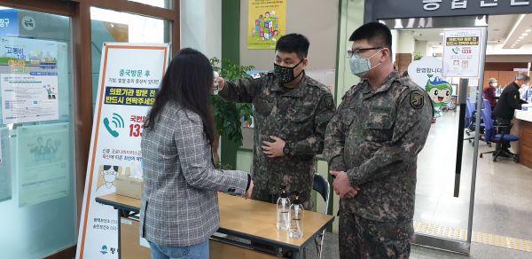 청북읍대 장병이 순번을 정해 일일 3시간씩 청북읍 행정복지센터를 방문하는 민원인을 대상으로 체온을 측정하고 손소독제 사용을 안내하는 등 코로나19 확산 방지를 위한 활동을 펼치고 있다.