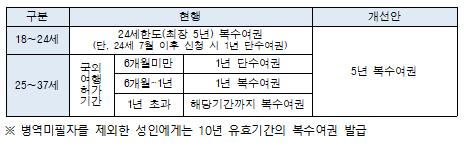 18세 이상 37세 이하 병역미필자에게 5년 유효기간의 복수여권 일괄 발급