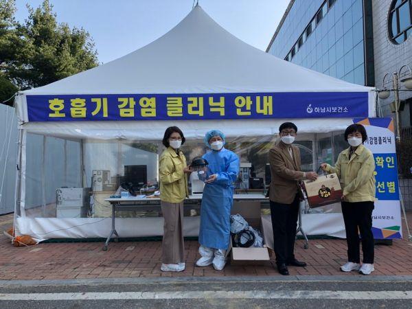 하남시는 지난 26일 이름을 밝히지 않은 한 시민께서 기부한 홍삼, 안면보호구, 글러브를 ‘호흡기 감염 클리닉’에 참여 중인 8명의 전문의에게 시민의 온정을 전하며 위로 물품을 전달했다.