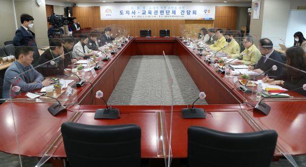 양승조 충남도지사는 27일 도청 중회의실에서 도내 교육 단체장과 간담회를 갖고 다음 달 6일 유·초·중·고등학교 개학과 관련한 의견을 수렴했다.
