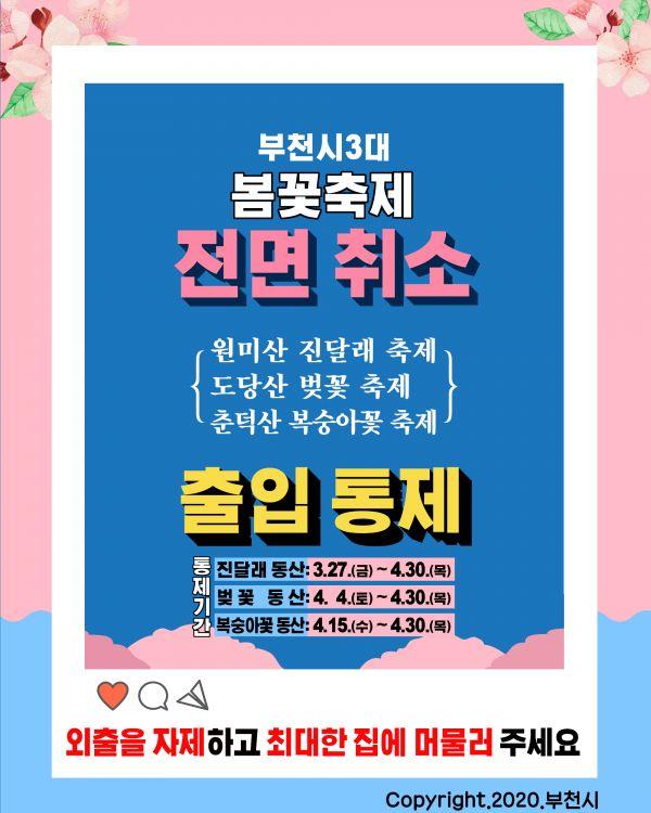 부천시가 코로나19의 지역 확산을 막고 시민들의 건강과 안전을 보호하기 위해 3대 봄꽃 축제 취소를 결정하고 봄꽃 축제장에 방문하는 상춘객 및 시민들의 안전을 위해 축제가 개최되는 원미산 진달래 동산, 도당산 벚꽃 동산, 춘덕산 복숭아꽃 동산 출입을 제한한다고 27일 밝혔다.