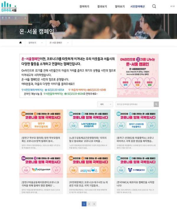 ‘온서울 캠페인’ 웹페이지에는 민관협력반에서 수집한 사례뿐만 아니라 시민들이 직접 코로나 대응과 관련해 실시한 방역 활동, 온라인 재능기부 사례 등도 게시할 수 있으며 게시를 희망하는 시민은 전자우편으로 제출하면 된다.