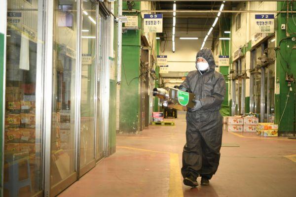 토요일 밤에는 전문방역업체를 통해 청과동 경매장을 시작으로 수산동 경매장, 산물동 및 양념동 순으로 내부 방역을 실시했으며 일요일 오전부터 구리시에서 보유한 방역차량으로 도매시장 내부도로를 따라 청과동, 수산동, 산물동의 건물 외곽에 대한 방역을 실시했다.