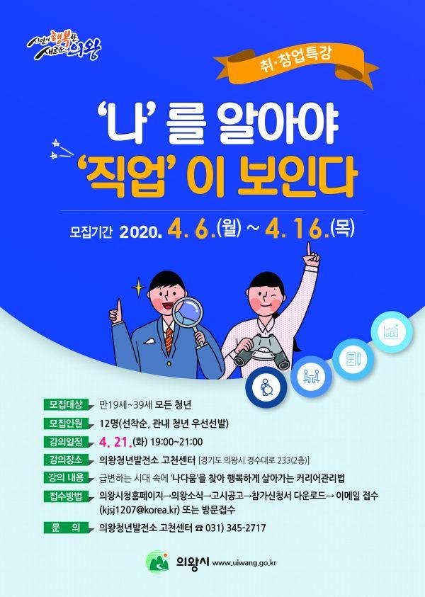 의왕시는 의왕청년발전소 고천센터에서 ‘나를 알아야 직업이 보인다’직업훈련 프로그램을 오는 4월 21일 시행한다고 밝혔다.