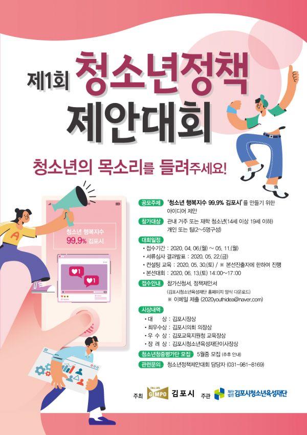 청소년정책 제안대회는 “청소년 행복지수 99.9% 김포시’라는 주제로 올해 처음 시행되며 관내 14세 이상 19세 이하 청소년이면 개인 또는 팀으로 누구나 참가할 수 있다.