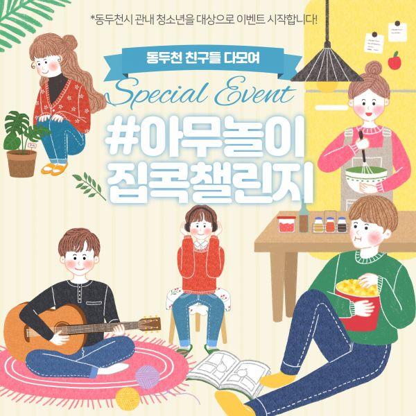 동두천시청소년상담복지센터는 코로나19 확산 방지를 위한 사회적 거리두기 캠페인을 실천하고 있는 청소년과 가족들을 응원하기 위해 26일부터 ‘#아무놀이집콕챌린지’ 이벤트를 진행하고 있다.