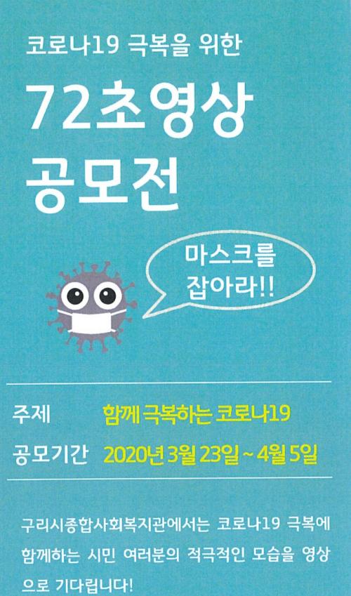 구리시는 코로나19 극복을 위한 시민들의 다양한 모습을 담은 72초 동영상을 구리시종합사회복지관에서 공모 중이다.