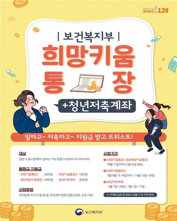 보건복지부 양성일 사회복지정책실장은 “청년저축계좌는 일하는 주거·교육급여 및 차상위 청년의 사회 안착을 지원하고 빈곤의 대물림을 방지하는 것이 목적”이라고 전했다.
