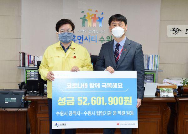 수원시가 수원시 공직자와 협업기관 직원들이 모은 ‘코로나19 피해극복 지원 성금’을 경기사회복지공동모금회에 지정 기탁했다.