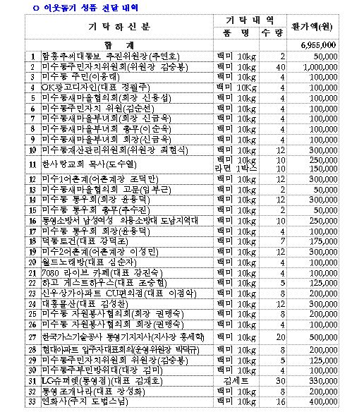 권영학 미수동장은 “경기침체로 어려운 살림살이에도 불구하고 사랑과 온정의 손길을 베풀어준 관내 자생단체 및 독지가 등에게 감사 인사를 전하였으며, 어려운 이웃이 소외되지 않도록 더욱 힘써 살기 좋은 미수동이 될 수 있도록 최선을 다하겠다”고 다짐했다.