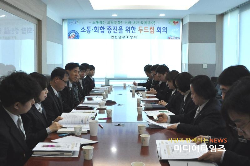 [미디어타임즈=문상수 기자] 인천남부소방서(서장 김성기)는 16일 본서 2층 소회의실에서 현장과 소통하는 소방정책 추진을 위한 '소통채널 두드림' 회의를 실시했다.'두드림'이란 일을 시작하기에 앞서 상대와 소통하기 위해 문을 두드린다는 의미로, 계급의 상하·본부와 서·중앙과 시도 직원간의 소통과 화합, 공감을 상징하는 명칭이다.이날 회의에는 화재·구조·구급 등 현장 활동 대원과 소방행정·예방·훈련 업무담당자 등 각 직무를 대표하는 회원 15명이 참석한 가운데 직장생활을 통해 겪는 고충과 애로사항 및 제도 개선을 위한 의견을 제시하여 공감대를 형성할 수 있는 브레인스토밍으로 진행되었다.주요 안건으로는 동료 직원의 고충, 인사 관련 건의사항, 직원 복지 등 다양한 의견이 제시되었으며, 매분기별로 회의를 진행하여 직원들의 의견을 수렴 직원 상호간 소통과 화합을 위한 조직문화 개선에 반영될 전망이다.소방서 관계자는 "직원들의 자발적 참여를 유도하고, 현장의 소리를 반영한 소방정책의 공감대 형성에 앞장서 나갈 것"이라고 말했다.