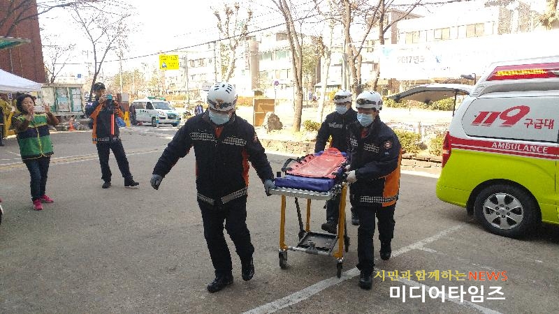 [미디어타임즈=문상수 기자] ‘2017년 지역·직장특성화 화생방 주민대피훈련’이 지난 15일 인천 남구 관교동 주민센터에서 실시됐다.북한의 생화학무기 테러위험에 따른 화생방 방호 대피훈련 일환으로 진행된 훈련에는 소방서, 민방위대원, 공무원, 주민 등 30여명이 참여했다.훈련은 가스가 분출된 상황을 가정, 신속한 주민 대피와 소방대가 출동해 현장을 수습하는 과정 등으로 진행됐다. 또 화생방 발생시 대피요령과 심폐소생술교육, 방독면 착용 방법 등 위기상황 발생시 초기대응 능력을 키울 수 있는 방법도 교육했다.