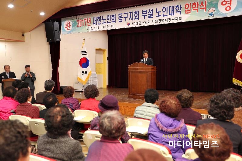 [미디어타임즈=문상수 기자] 인천 동구 대한노인회 동구지회(지회장 박희중)는 지난15일 동구노인복지관 2층 강당에서 이흥수 동구청장을 비롯한 각 경로당 회장과 수강생 및 지역주민 등 200여 명이 참석한 가운데 제32기 노인대학 입학식 행사를 가졌다.노인대학(노인대학장 최병란)은 고령사회에 접어들면서 어르신들이 건강한 프로그램에 적극 참여, 생활화할 수 있도록 호응도가 좋은 노인 건강 과목을 연중 운영함으로써 활력이 넘치는 노인문화 조성으로 행복하고 건강한 복지사회를 만들고자 대한노인회 동구지회에서 운영하고 있다.이날 입학식은 공식행사와 함께 노인대학에 대한 운영사업 계획과 학사 운영 일정 안내 등 교육 참가자에 대한 오리엔테이션으로 진행됐다.한편 노인대학은 요가교실, 건강백세체조, 노래교실, 문화체험 등 다양한 강좌들이 매주 수요일 동구노인복지회관에서 9시부터 18시까지 운영되며 여가선용 및 건강 유지를 원하는 노인들은 누구나 참여할 수 있다.이흥수 구청장은 축사를 통해 “노년에도 배움에 대한 열정을 갖고 모이신 분들이 존경스럽다”며 “노인대학을 통해 건강한 생활을 유지하여 어르신들이 동구 지역사회의 중심이 되어 주시길 바란다”고 말했다.한편 노인대학 관계자는 “앞으로도 노인들의 취미활동과 건강관리 생활화에 중점을 두고 편안하고 부담 없이 찾을 수 있는 열린 공간으로 노인대학을 운영해 나갈 계획”이라고 덧붙였다.
