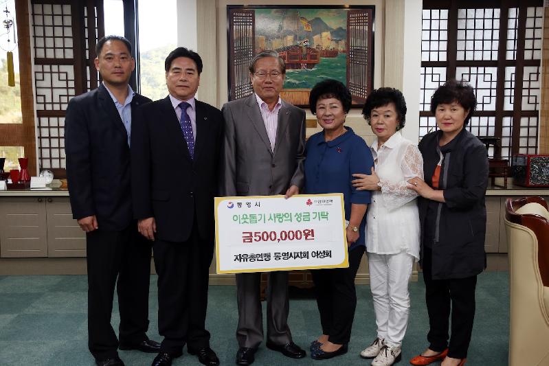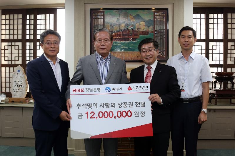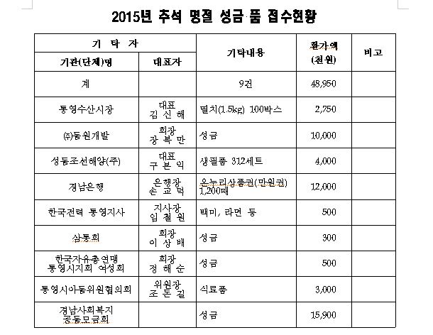 통영수산시장(대표 김신해) 멸치100박스, ㈜동원개발(회장 장복만) 성금 1,000만원, 경남은행(은행장 손교덕) 온누리상품권 1,200만원, 성동조선해양(주)(대표 구본익) 생필품 312세트, 한국자유총연맹 통영시지회 여성회(회장 정해순) 성금50만원, 통영시아동위원협의회(위원장 조돈길) 식료품(300만원상당), 통영고교 33회 졸업생 모임인 삼통회 성금 30만원 등 이웃돕기 성금·품을 기탁받아 정부의 복지수혜를 받지 못하는 관내 독거노인, 차상위계층 등 취약가정 1,106세대및 복지시설 25개소에 전달하여 기탁자들의 따뜻한 마음을 전했다.