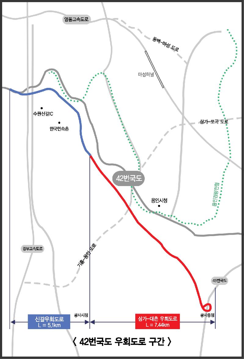 삼가~대촌과 신갈지역 등 2곳으로 나뉘어져 진행되고 있는 우회도로는 각각 2018년말과 2019년 3월 준공 예정으로 57%와 79%의 공정률을 보이고 있다. 이 도로사업은 처인구 도심에서 기흥지역을 관통하는 42번 국도에서 상습정체를 빚는 대표적인 구간이다.