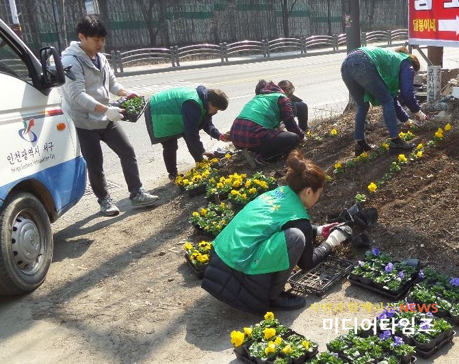 [미디어타임즈=홍기연 기자] 인천 서구 검단2동(동장 유광희)은 지난 16일 새봄을 맞이하여 ‘아름다운 마을 만들기’ 일환으로 꽃길조성 팬지 등 초화류를 식재했다.이날 행사에는 주민자치위원회(회장 양혜경)를 비롯하여 6개 단체 70여명이 참여했으며, 검단로 일대 300미터 가로수 길에 팬지, 비올라 등을 심어 주민들과 함께 즐길 수 있는 아름다운 가로수 길을 만들었다. 또한 이날 단체별로 지역 내 공원 7개소 찾아 잡초 제거 등 환경정비도 실시했다.