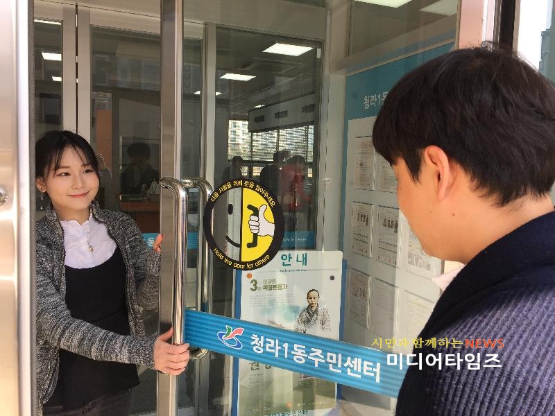 [미디어타임즈=홍기연 기자] 인천 서구 청라1동 주민센터 출입문에는 ‘배려의 거울’로 불리는 독특한 거울이 부착되어 있다.