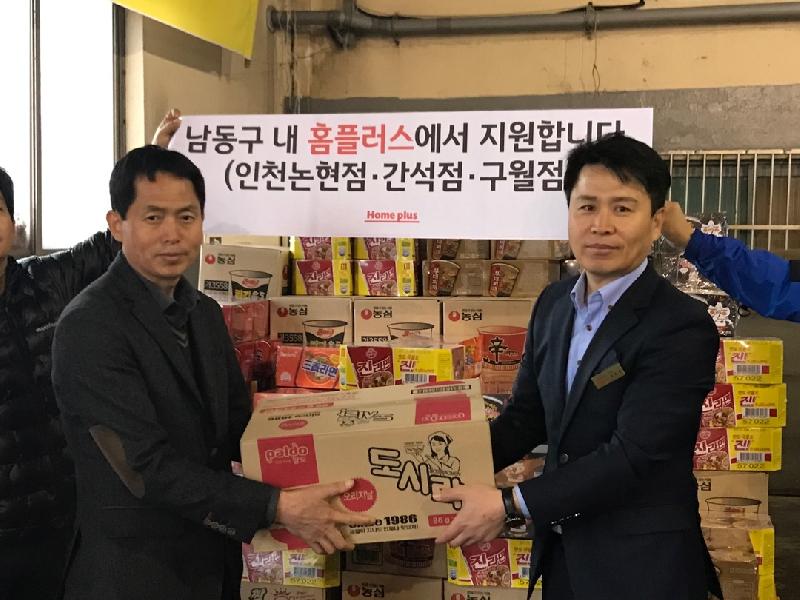 [미디어타임즈= 신정식 기자] 인천시 남동구 관내 홈플러스(인천논현점, 구월점, 간석점)에서는 지난 18일 소래포구 재래어시장 화재발생 소식을 접하고, 400여만원 상당의 라면, 햇반, 일회용 국 등의 구호물품을 전달했다.