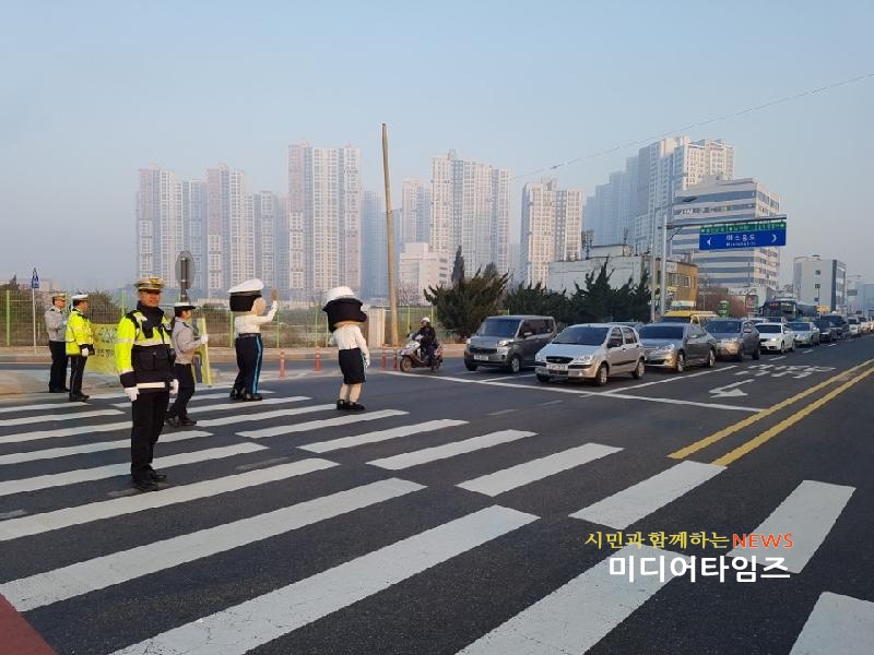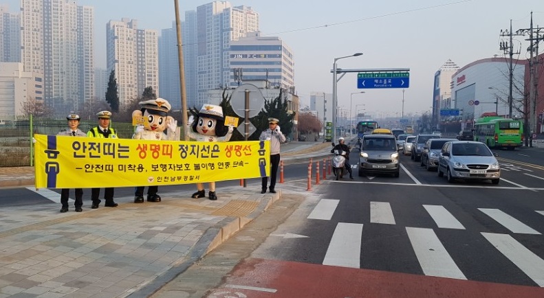[미디어타임즈=문상수 기자] 인천남부경찰서(서장 조종림)은 지난18~19일 주말 이틀간 신세계백화점 사거리, 숭의사거리 등 관내 중요교차로를 대상으로 플래시몹 교통안전 캠페인을 실시했다.캠페인은 날씨가 풀리면서 주말을 이용해 거리로 나오는 많은 시민들의 안전한 보행과, 운전자들의 안전을 위한 취지로 진행되었으며,이날은, 관내의 차량통행량과 보행자가 많은 교차로를 찾아가 정지선과 안전띠는 생명선·생명띠 문구가 새겨진 피켓을 들고 신호대기 차량으로 가 법규준수를 강조하는 활동을 펼쳤다.이에, 조종림 남부서장은 “정지선 준수와 안전띠 착용은 교통질서 선진화의 첫걸음이다, 보행자를 위한 그리고 운전자인 나를 위한 배려있는 교통문화의 정착이 무엇보다 중요하다”며 “이제 행락철이 시작된 만큼 주말에는 차량과 시민들이 많은 곳을 찾아가 교통 홍보를 지속적으로 펼치겠다”고 말했다..