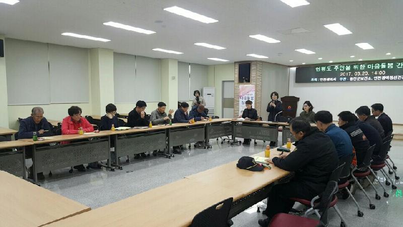 [미디어타임즈=문상수 기자] 옹진군보건소는 3월 20일(월) 연평면 주민을 대상으로 「서해5도 마음건강 사업」추진을 위한 지역 간담회를 가졌다.「서해5도 마음건강 사업」은 특수한 지리적 여건으로 지속적 북한의 도발에 따른 정신건강문제가 가중되는 취약지역 주민들에게 고위험군 조기발견을 위한 선별검사, 등록자 사례관리, 마음돌봄 상담실 운영(월1회), 찾아가는 전문의 상담 등 다양하고 체계적인 정신건강서비스를 제공한다.이날 간담회에는 인천광역정신건강증진센터의 정신보건전문요원 3인을 포함한 관계자 5인이 방문하여 서해5도 마음건강사업 홍보와 더불어 고위험군 발굴․연계에 관한 사항 등을 협의하였으며, 보건지소, 학교, 경찰서, 소방서, 마을관계자들도 한자리에 모여 유관기관 네트워크 구축을 위한 시간을 가졌다. 군 보건소 관계자는 “연평면을 시작으로 오는 27~29일 백령․대청면을 방문할 예정이며, 「서해5도 마음건강 사업」을 통하여 지역내 정신보건 인프라 부재와 생업 및 경제적 부담으로 육지 통근치료가 어려운 주민들이 시혜를 받을 수 있도록 적극 홍보하고, 우리 군 주민들이 지역사회에서 안정감과 행복감을 느낄 수 있도록 최선을 다할 것”이라고 밝혔다.
