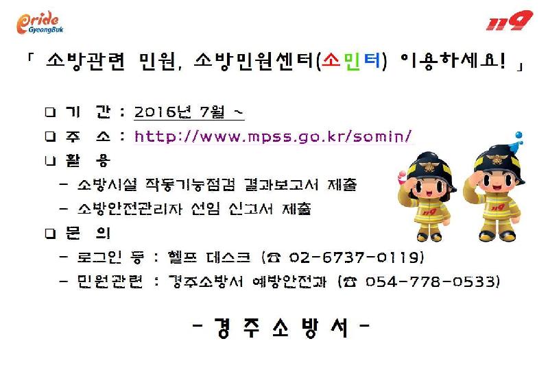경주소방서(서장 안태현)는 소방관련 민원을 인터넷을 통해 간편하게 신청할 수 있는 ‘소방민원센터’ 홍보에 나선다. 소방민원센터(이하 소민터)란 소방서를 방문하여야만 처리가 가능했던 기존의 소방관련 민원들을 인터넷으로 간편하게 신청, 처리할 수 있는 사이트를 말하며, 지난해 7월부터 운영하고 있다. 소민터에서 처리가 가능한 소방관련 민원은 소방시설법에 따라 건물의 관계인(소유자, 점유자, 관리자)이 연 1회 이상 실시하여야 하는 소방시설 작동기능점검 결과보고서 제출, 같은 법에 따른 소방안전관리자 선임신고서 제출이다. 경주 관내에 소방시설 작동기능점검을 실시하고 그 결과를 제출하여야 하는 약 2,470여 개의 소방대상물 관계인은 현재까지 점검 결과보고서를 경주소방서 예방안전과로 인편 또는 우편을 통해 제출해왔으며, 소방안전관리자 선임 신고 또한 관할 119안전센터에 방문하여 신고서를 제출하여야 하는 불편함이 있었다. 이에 경주소방서는 소민터 이용을 홈페이지 등을 활용해 적극 홍보하여 관내 소방관련 민원인들의 이동 불편함을 덜고자 노력하고 있다. 안태현 경주소방서장은 “기존에 소방관련 민원 신청을 위해 소방관서를 방문해야하는 불편함이 있었다.”며, “정보화시대에 발맞춰 소방관련 민원을 인터넷을 통해 간편하게 처리할 수 있는 소민터를 이용해 줄 것을 당부 드린다.”고 전했다.