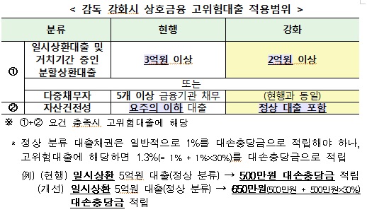 상호금융의 경우 현행 고위험대출 적용범위를 확대하고, 추가충당금 적립률도 20%에서 30%로 높인다. 관계부처간 협조를 통해 신협조합, 농협조합, 수협조합, 산림조합, 새마을금고에 제도개선 사항이 동일하게 시행될 수 있도록 할 예정이다.