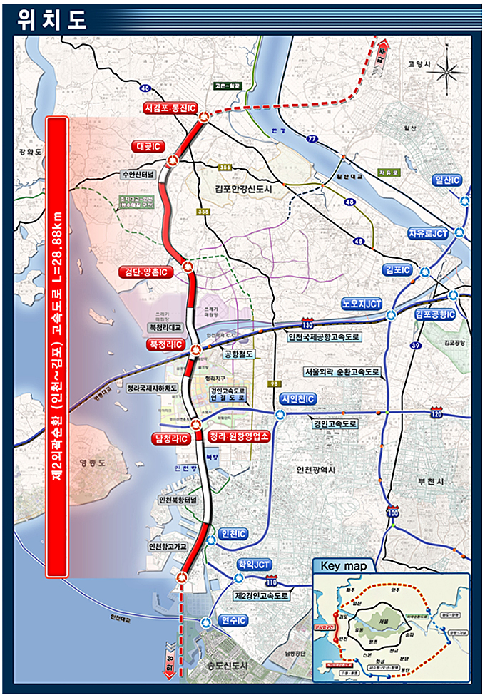 인천~김포 고속도로는 인천 중구에서 경기 김포를 연결하는 28.88km, 왕복 4∼6차선 도로로 1조 7000억 원의 사업비가 투입됐다.