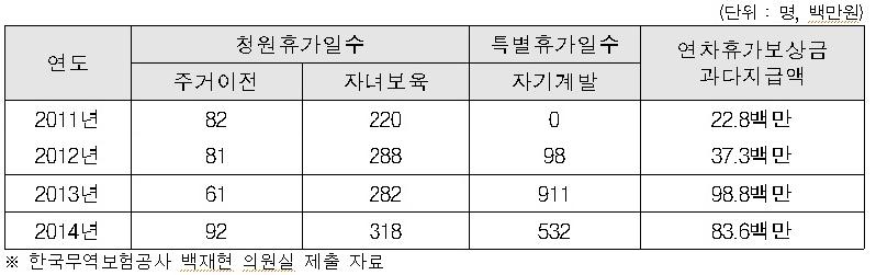 휴가제도 역시 부적절하게 운영되고 있었다. 무보는 이미 2010년에 감사원 감사를 통해 기재부의 「공기업·준정부기관 예산집행지침」에 따라 연차 유급휴가 외에 이와 유사한 청원휴가 및 특별휴가를 운영해서는 안 됨에도 불구하고 가족행사 청원휴가나 안식 특별휴가 등을 운영하고 있는 점을 지적받은 받은 바 있다. 그러나 이후 ‘눈가리고 아웅’ 식으로 가족행사 사유의 청원휴가를 폐지하는 대신 그와 유사한 자녀보육 사유의 청원휴가를 신설했고, 안식 특별휴가를 폐지하는 대신 역시 그와 유사한 자기계발 특별휴가를 신설했다. 2011년부터 2014년까지 최근 4년간 무보 직원들은 2,965일의 청원휴가(주거이전, 자녀보육)와 특별휴가(자기계발)를 사용했고, 무보는 그 청원휴가와 특별휴가 대신 연차휴가를 사용했다면 지급하지 않아도 될 약 2억 4천만원을 연차휴가보상금 명목으로 지급했다.