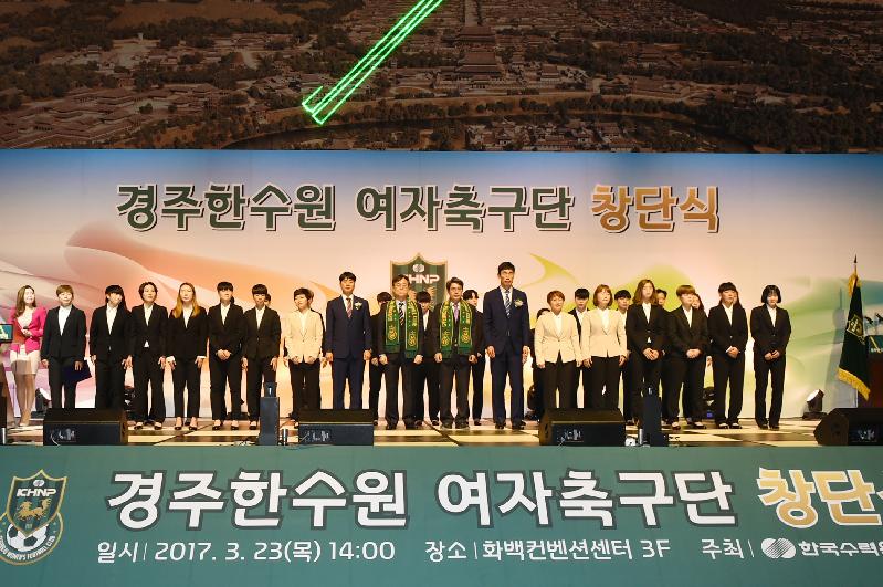 경주를 연고로 한 한수원 여자축구단이 국내 8번째 여자축구 실업팀으로 본격적인 활동에 들어간다. 경주시(시장 최양식)는 23일 화백컨벤션센터(HICO)에서 한수원, 한국여자축구연맹, 경주시 축구협회 등 300여명의 관계자가 참석한 가운데 경주 한수원 여자축구단 창단식을 가졌다고 밝혔다. 한수원은 경주본사 이전에 따른 지역상생경영 방침에 따라 2013년 한수원 남자축구단 연고지를 경주로 옮긴데 이어 이번에 경주를 연고로 한 여자축구단을 창단하게 됐다. 한수원 여자축구단은 2014년 U-20 여자대표팀 코치, 2015년 U-16 여자대표팀 감독을 역임한 여자축구 전문가인 하금진 감독을 비롯한 5명의 코치진과 27명의 선수로 선수단 구성을 마쳤다. 다음달 14일 충북보은종합운동장에서 보은 상무여자축구단과의 WK리그 개막전을 갖는 경주 한수원여자축구단은 2012년 충남 일화가 해체되면서 7개팀으로 줄어든 여자축구계에 새로운 활력을 불어 일으킬 전망이다. 한수원 본사 경기장에서의 홈 개막전은 다음달 17일 오후 7시에 열린다. 최양식 경주시장은 “이번 한수원 여자축구단 창단으로 남여 실업축구단과 시민축구단을 모두 보유한 유일한 지자체로 거듭나게 되었다.”며, “경주 한수원 여자축구단이 신생팀의 패기와 열정을 바탕으로 여자축구리그에 새로운 돌풍을 일으켜 경주와 한수원의 위상을 크게 높여 줄 것”이라며 기대를 전했다.