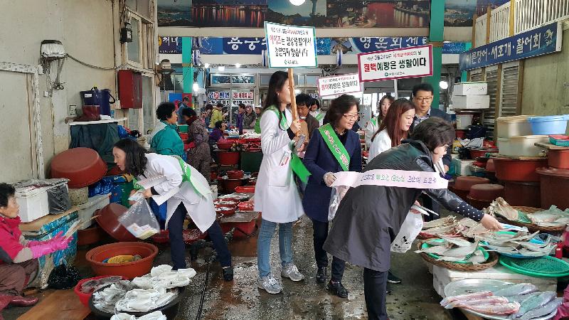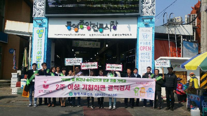 | 지난 14일 중앙시장, 21일 서호시장, 24일 문화마당에서 결핵예방, 결핵치료, 기침예절 지키기에 대하여 국민건강보험공단 결핵치료 병원과 함께 홍보 캠페인 모습(사진=통영시청 제공) |