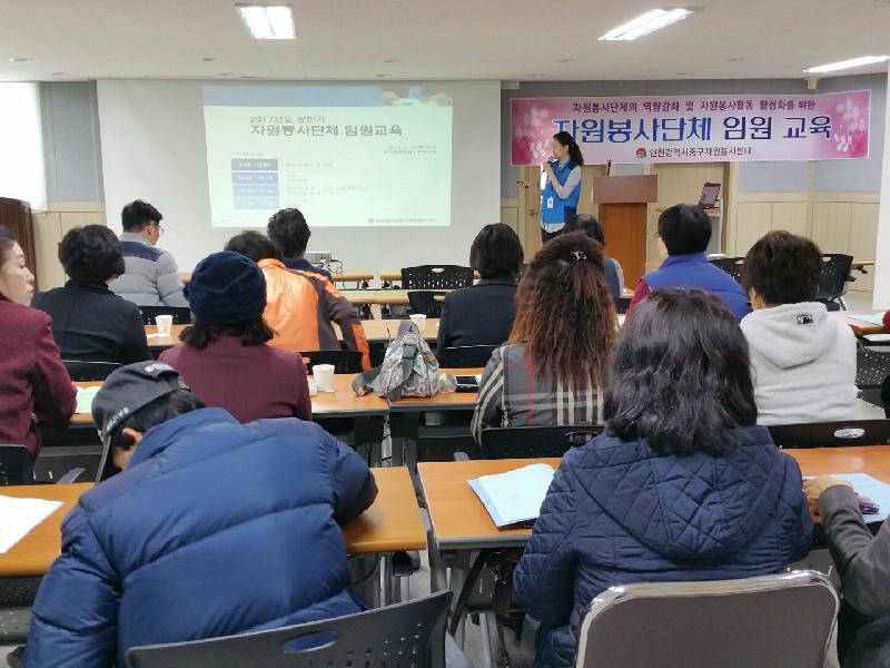 [미디어타임즈=문상수 기자] 인천중구자원봉사센터(소장 이주영)에서는 한국자원봉사의 해를 맞이하여 지난 23일 중구보훈회관 4층 대강당과 지난24일 공항신도시경로당 다목적실에서 양일간「2017 상반기 자원봉사단체 임원 교육」을 실시했다.이번 교육은 센터에 등록되어 자원봉사활동을 활발히 전개하고 있는 50여 단체의 자원봉사단체장 및 임원 90여명을 대상으로 센터의 자원봉사 행사지원, 자원봉사자 인정제도, 자원봉사 특성화 프로그램 등 2017년도 상반기 주요사업 및 현안사항에 대해 안내하였다. 이번 자원봉사단체 임원 교육을 통해, 소속 자원봉사자들의 적극적인 참여와 지원을 통해 자원봉사활동이 활성화 될 수 있도록 다짐하는 소중한 자리가 되었다.중구자원봉사센터 이주영 소장은 “어려운 여건 속에서도 지역의 최일선에서 소외된 이웃들에게 봉사와 사랑을 나누어 지역사랑과 이웃사랑을 몸소 실천하고 자원봉사활성화에 기여를 해 주신데 대해 감사하다”며 고마움의 마음을 전했다. 또한, 센터는 등록된 자원봉사단체를 대상으로 지속적인 관리와 지원을 통해 자원봉사활동 참여의 보람과 만족도를 높여 나갈 수 있도록 봉사활동 환경을 만드는데 최선을 다해나갈 계획이다.