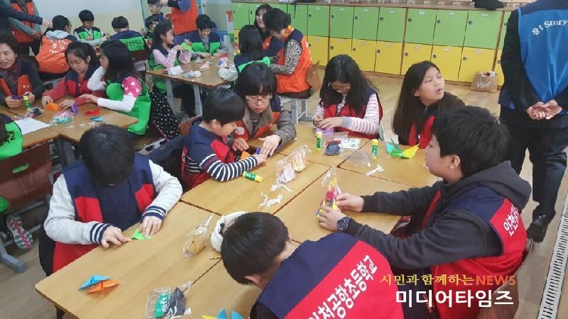 [미디어타임즈=문상수 기자] 인천중구자원봉사센터(소장 이주영) 영종분소는 지난 25일 공항초등학교에서 『One Day 자원봉사체험의 날』활동을 진행했다.이날 행사에는 공항초등학교 봉사동아리 3~6학년 학생 30여명과 함께 했으며, 프로그램으로 어르신들에게 전달할 종이 커피방향제 만들기 활동을 하였다.지난 주말, 공항초등학교 어학실에서 중구자원봉사센터 영종분소 소속‘종이접기 전문봉사단’과 함께 우리나라 고유전통의 한복을 종이 접은 뒤 한복치마 부분에 볶은 원두커피를 넣어서 커피방향제를 완성시켰다. 커피방향제는 냄새와 습기를 잡아줄뿐더러 만들어진 방향제 모형도 예뻐 학생들에게 인기가 많았다.또한 완성된 종이 커피방향제는 추후 공항초등학교 봉사동아리 학생들이 직접 인근 경로당에 방문하여 어르신들에게 나눠주며 경로당 청소 봉사활동도 같이 진행할 예정이다.‘One Day 자원봉사 체험의 날’ 담당 직원은 “작년에 이어 올해도 공항초등학교에서 월 1회로 프로그램을 진행할 예정으로 참여하는 아이들에게는 흥미로운 자원봉사활동을 제공하며, 지역주민에게도 많은 도움을 줄 수 있는 자원봉사활동을 계획할 것이다.”라고 말했다.