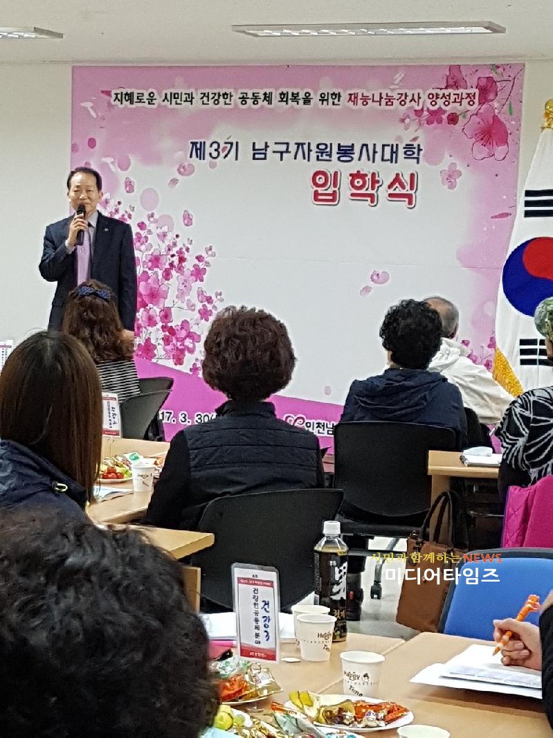 [미디어타임즈=문상수 기자] 인천 남구자원봉사센터는 지난 30일 ‘제3기 남구자원봉사대학 입학식’을 가졌다.행사에는 남구자원봉사대학 입학생 80여명이 참석했다.행사는 참여가 즐거운 자원봉사 활성화의 견인 역할을 다짐하는 선서와 학사일정 소개, 인천통기타마을의 사랑과 행복을 전하는 재능 나눔 축하공연 등으로 진행됐다.또 김채옥 강사의 ‘지혜로운 시민, 건강한 공동체’를 주제로 재능 나눔 강사 교육의 첫 출발을 알렸다.한 입학생은 “이번 교육을 통해 전문자원봉사자로 거듭나 한 차원 높은 봉사활동을 하고 싶다”며 “다양한 자원봉사활동에 참여했지만 이번 교육이 더 기대된다”고 말했다.한편 남구자원봉사대학은 도서관, 교육, 환경, 건강·안전 4개 분야로 구성됐으며, 분야별 총 20회, 1년 과정으로 진행된다.교육을 통한 전문지식 습득 이후에는 재능 나눔 강사 활동을 통해 자원봉사 활성화에 참여하게 된다.
