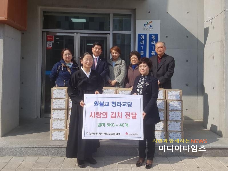 [미디어타임즈=홍기연 기자] 인천 서구 청라1동(동장 유미순)은 지역 내 원불교 청라교당에서 지난 30일 어려운 이웃에 전달해 달라며 ‘사랑의 김장김치’ 40통(200kg)을 청라1동 지역사회보장협의체에 기탁했다.