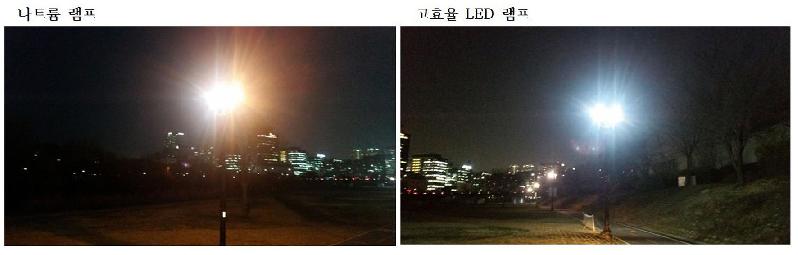 | 성남 탄천 하천등 조명시설에 달린 나트륨 램프와 LED 램프 비교 사진. |