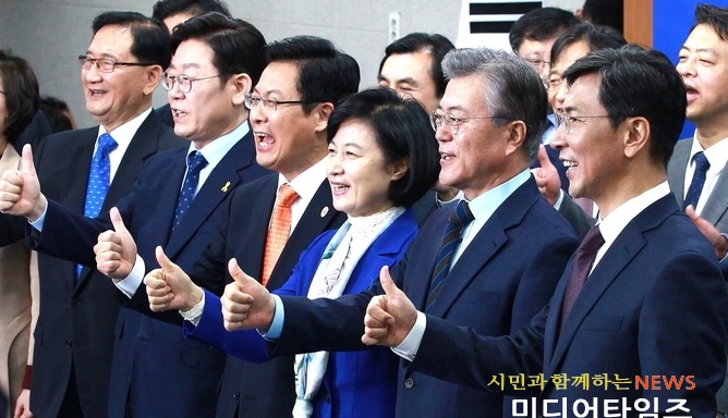 | 지난 14일 오전 서울 여의도 더불어민주당 당사에서 열린 더불어민주당 제19대 대통령선거후보자 공명경선 선언식에서 서명에 앞서 기념촬영을 하고 있다. 왼쪽부터 홍제형선관위원장, 이재명 성남시장, 최성 고양시장, 추미애 대표, 문재인 전 대표, 안희정 충남지사. <사진=미디어타임즈> |