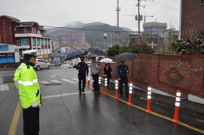 | 초등학생 교통사고 예방과 안전한 통학로 확보를 위해 지난 3월31일 아침 08:00경 우천에도 불구 아주초등학교 앞 통학로를 찾아 교통정리 중인 경찰관 모습(사진=거제경찰서 제공) |