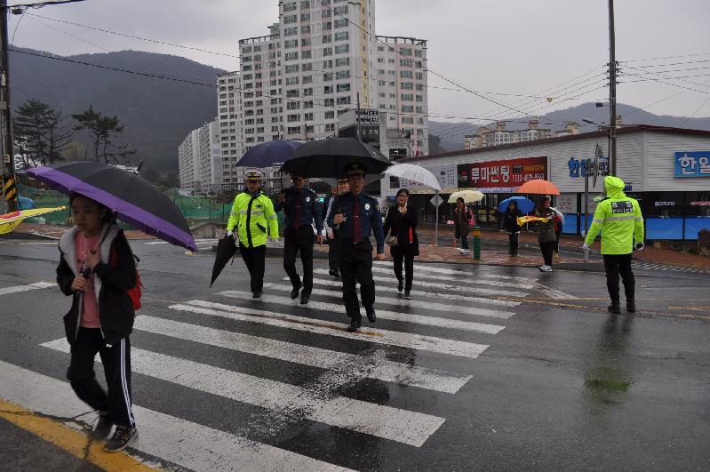 김주수 경찰서장은 초등학생 교통사고 예방과 안전한 통학로 확보를 위해 3월31일 아침 08:00경 우천에도 불구 아주초등학교 앞 통학로를 찾아 교통정리 중인 경찰관 격려와 함께 교통봉사활동 중인 녹색어머니, 안전지킴이들에게 감사의 표시를 하였다.