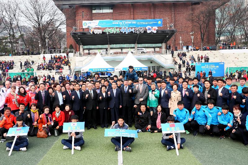 | 3월31일 '한-중-러 3대 도시 경제관광 포럼 및 문화체육 대제전'개막식에서 양기대 광명시장, 세르게이 하산군수, 청 숭진 훈춘부시장과 선수단이 기념촬영을 하고있다. |