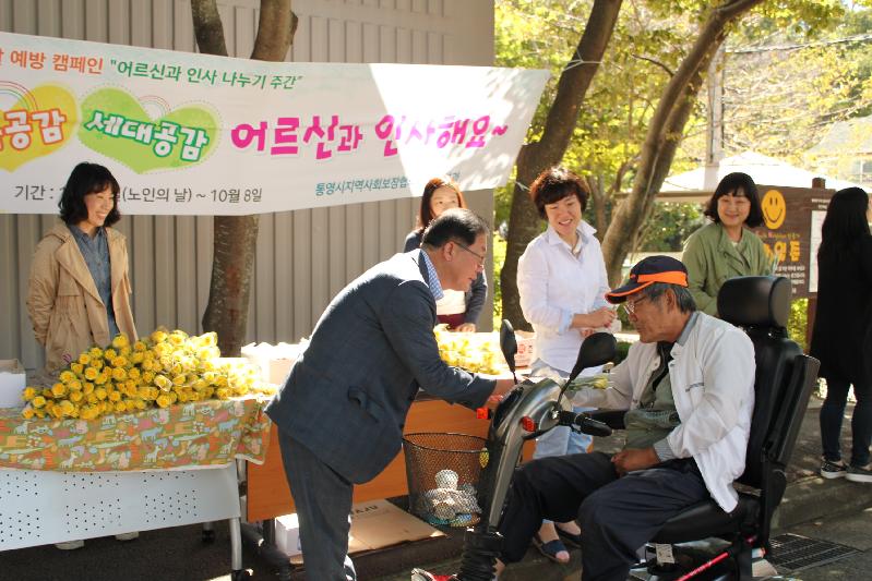 통영시(시장 김동진)는 통영시사회보장협의체 노인분과(분과장 강병구) 주관으로 지난10월 2일 노인의 날을 맞아 일주일간을 “노인과 웃으며 인사하기 주간”으로 선정하고 봉평동 소재 아파트 일대에서 어르신과 인사하기 캠페인을 펼쳤다.