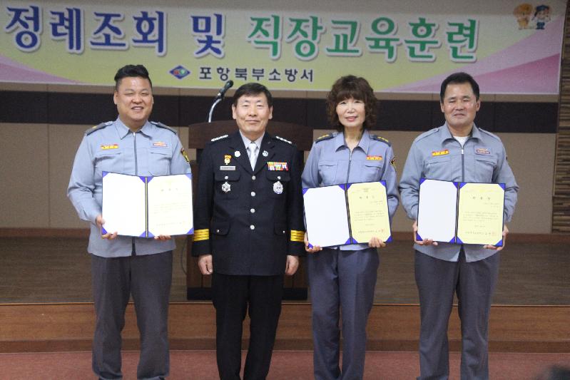 포항북부소방서(서장 오원석)는 3일 오전 10시, 3층 대회의실에서 직원 정례조회시간에 “우리동네 생활안전리더”로 지정된 의용소방대원 4명에 대한 위촉장을 수여하였다. ‘우리동네 생활안전리더’란 도내 17개 소방관서 75명으로 구성돼 있으며, 소방서별 4~5명씩 자체 편성 운영된다. 이들은 모두 한국소방안전협회에서 운영하는 생활안전강사 자격을 취득한 사람으로 일상생활 속에서 다양한 위험요소를 사전에 제거하고 주민대상 안전문화 전파를 목적으로 한다.소방서 관계자는 “우리동네 생활안전리더는 주민주도형 안전대책”이라며 “안전문화 확산과 사고방지를 위해 이런 민간차원의 도움이 필요하다며 협조”를 부탁하였다.