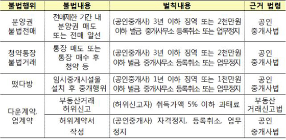 국토부는 앞으로 부동산 불법거래를 알선하는 등 공인중개사의 불법행위가 적발된 경우에는 업무정지 및 등록취소 등 관련법에 따른 벌칙 등을 엄격하게 적용하도록 하겠다고 밝혔다.