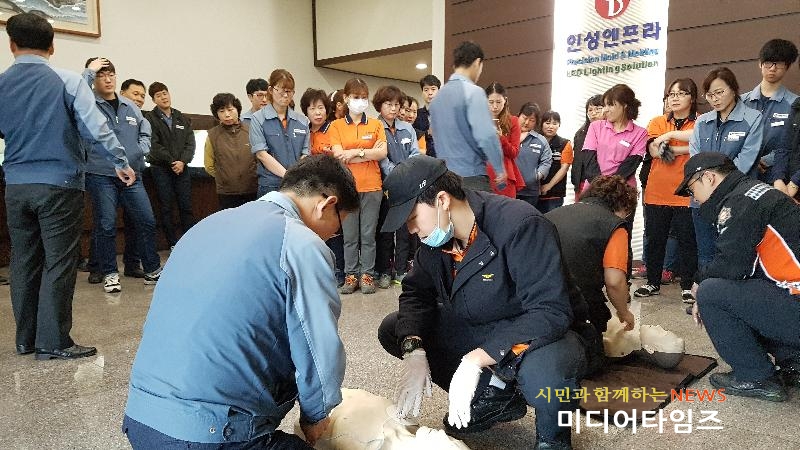 [미디어타임즈=홍기연 기자] 인천서부소방서(서장 김준태)석남119안전센터는 지난6일 가좌동 소재 인성엔프라(주)의 전직원에 대한 소방훈련 및 심폐소생술 교육을 실시했다. 가좌동 공장단지에 위치한 인성엔프라(주)는 유망중소기업으로서 매년 소방관서와 합동훈련을 하는 대상으로 2016년 대통령 수상을 받은 세계일류기업이다.