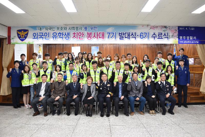 경주경찰서(서장 양우철)는, 경찰서 화랑마루에서 외국인 유학생 치안 자원봉사대 7기 발대식과 6기 수료식을 개최하였다. 이번 행사에서는 경주경찰서, 경주시청, 경주YMCA, 동국대 경주캠퍼스·위덕대 국제교류팀등 관계기관 및 유학생 37명 등 총50명이 참석한 가운데 발대식 및 수료식을 개최했다. ‘외국인 유학생 치안봉사대’는 경주경찰서에서 전국 최초로 발대하였으며, 지난 2011년을 시작으로 경주지역 2개 대학교(동국대, 위덕대)의 모범적인 유학생들을 추천받아 운영해 오고 있다.