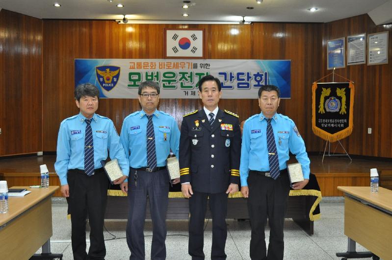 [미디어 타임즈 = 최귀복 기자] 거제경찰서(서장 김주수)는 4월 4일 경찰서에서 모범운전자회 1/4분기 간담회를 실시했다. 모범운전자회 거제지회(회장 김재환)는 택시, 전세버스, 시내버스 등 운수업 종사자 66명으로 구성된 봉사단체이며, 올바른 교통문화정착을 위한 교통캠페인 및 각종 관내행사, 차량정체구간 등 경찰의 인력이 미치지 못하는 구간에 대한 교통관리 봉사활동을 하는 단체이다. 간담회에서는 그간 거제지역 교통관리 봉사활동을 열심히 한 회원 3명에 대한 감사장 수여와 함께 최근 거제에 잇따라 발생하고 있는 교통사망사고 예방을 위해 거제의 도로 사정에 가장 밝은 모범운전자회 회원들과 토론하고 교통안전시설 개선과 보완이 필요한 부분에 대한 의견을 들었다. 김주수 경찰서장은 바쁜 와중에도 경찰의 부족한 인력을 도와 교통관리 등 많은 도움을 주는 모범운전자회 회원 한 사람 한 사람 손을 잡으며 감사의 인사를 하였으며, 모범운전자회도 본격적인 행락철을 맞아 거제를 찾는 관광객과 지역축제 등으로 인한 교통봉사활동에 적극 동참하기로 하였다. 마지막으로 시민들에게는 모범운전자회가 도로교통법상 경찰과 동일한 효력의 수신호 권한을 가지고 있으며, 모범운전자가 하는 수신호를 위반 시 신호위반으로 처벌되므로 경찰을 대신한 모범운전자회 회원들의 교통 수신호시 반드시 신호를 준수할 것을 당부했다.