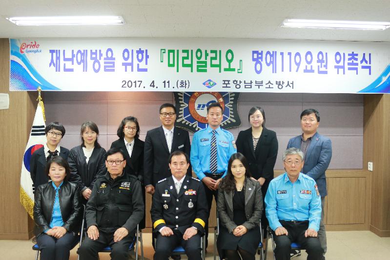 포항남부소방서(서장 은대기)에서는 4월11일 모범운전자연합회 포항남부지회와 포항시 재가노인회 신규 명예119요원에 대한 위촉식 및 역량강화교육을 실시하였다. 이날 위촉식에서는 ▲신규 명예119요원 위촉장 수여 ▲미리알리오 운영취지 및 재난발생시 신고요령 안내 ▲소소심(소화기,소화전,심폐소생술) 교육 등을 실시하였다. 한편, 『미리알리오』제도란 도민의 안전한 생활을 위해 현지사정에 밝은 민간자원을 명예119요원으로 위촉하여 지역 재난예방 및 대응활동을 하는 제도로서 포항남부소방서에서는 현재 212명(모범운전자 185, 요양보호사 27)의 명예119요원이 활동하고 있다. 명예119요원으로 위촉된 대원들은 지역의 각종 사고 발견 시 119에 신고함과 동시에 화재초기진화 및 환자 초동조치의 업무를 맡고 있다. 은대기 포항남부소방서장은 “지역주민의 안전한 생활을 위해서는 미리알리오 명예119요원의 역할이 크다면서, 사명감을 가지고 화재예방 및 재난방재의 파수꾼 역할을 담당해줄 것을 당부드린다.”고 전했다.