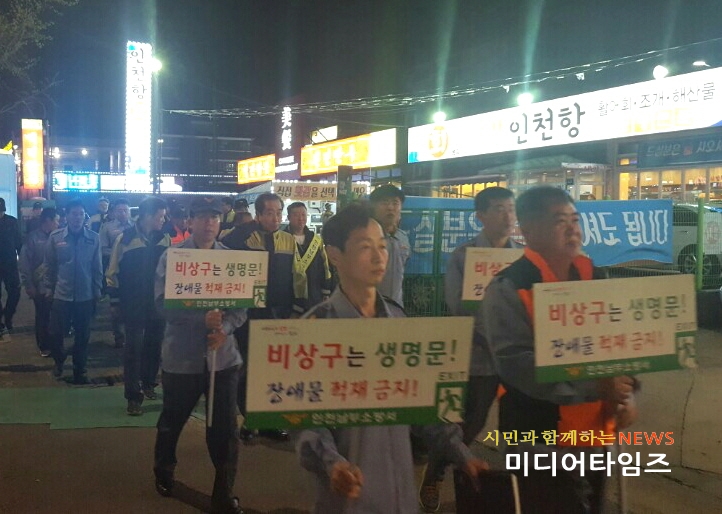 [미디어타임즈=문상수 기자] 인천남부소방서(서장 김성기)는 지난11일 저녁 남구 신기시장사거리 인근 다중이용업소 밀집지역을 대상으로, 자율적인 안전관리의 적극 수행과 안전문화 확산 및 피난통로 환경개선을 위한 ‘비상구 안전관리’ 캠페인을 실시했다.이날 행사는 소방공무원 및 의용소방대원등 30여명이 참여하였으며, 다중이용 장소에서 화재사고 시 비상구의 역할과 소중함을 일깨우고 다중이용시설 관계자의 자율적이고 적극적인 안전관리 참여를 유도하기 위함이다. 주요활동 내용으로는 ▲다중이용업주가 지켜야 할 의무사항 및 정기점검 매뉴얼 앱 홍보 안내문(스티커)배부 ▲다중이용시설 및 밀집지역에 대한 비상구 안전관리 지도 ▲비상구 장애물 방치 및 페쇄행위 근절을 위한 집중 홍보 등을 실시하였다.소방서 관계자는 “불특정 다수인이 운집할 것으로 예상되는 다중이용시설의 관계자는 비상구 안전관리를 철저히 해야 하며, 방문 고객은 비상구 위치를 확인하는 습관을 가져 유사시 대피할 수 있도록 해야 한다.”고 당부했다.