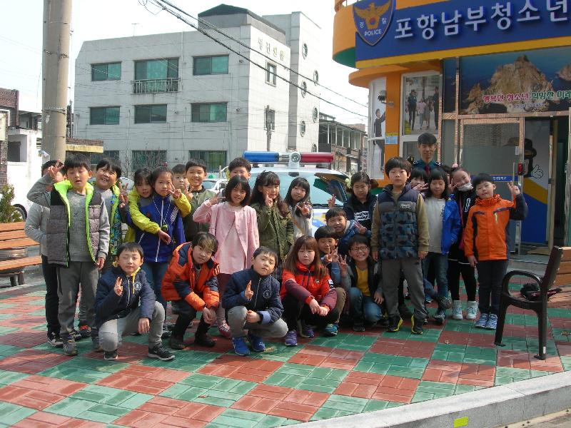 포항남부 청소년경찰학교는 신학기를 맞아 『우리아이 안전하게 학교가기』프로젝트 일환으로 지난달 20일부터 4월 13일까지 8회에 걸쳐 대해초등학교 3,4,5,6학년 210명 대상으로 범죄예방 안전교육 및 경찰체험 프로그램을 실시하였다. 경찰 순찰차 체험은 초등학생들이 가장 선호하는 체험 프로그램으로 손꼽을 수 있는데 순찰차에 장착된 무전기, 경광등, 싸이렌 등 사용방법과 기능을 살펴보며 직접 시승해 보는 등 흥미를 돋구었다. 여러 가지 경찰제복을 착용하고 경찰수갑, 무전기, 삼단봉 등 경찰장비를 이용한 즉석 시나리오를 만들어 현장 재연을 해보는 이색적인 경험으로 경찰 체험에 참여한 학생들에게 큰 호응을 얻기도 하였다. 또한 경찰의 계급과 상징, 법집행기관으로서의 경찰의 임무와 역할 등을 경청하면서 경찰의 위엄과 자긍심을 가지게 되었다는 한 6학년 여학생은 옆 친구들을 의식하지 않고 경찰관에게 “아저씨 오늘 제가 경찰관 꿈을 가지게 되었어요”라며 당당하게 소감을 밝히는 친구도 있었다. 행복하고 안전한 학교생활의 핵심인 학교폭력예방 교육은 또래간 흔히 발생하고 있는 언어폭력 형태를 살펴보면서 평소에 잘못된 언어 습관이 얼마나 무섭고 지울수 없는 큰 상처로 남게 되는 것인지 돌아보는 시간을 가졌다.