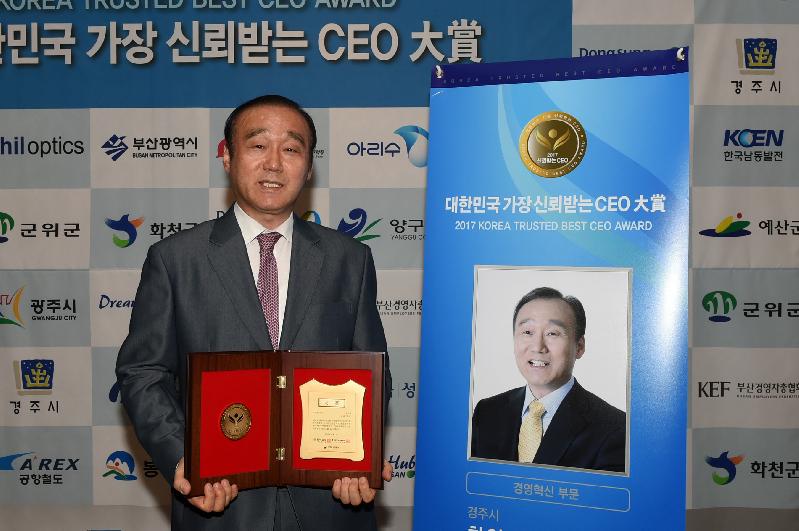 최양식 경주시장이 능동적인 사고와 경영능력으로 ‘2017 대한민국 가장 신뢰받는 CEO 대상’에서 경영혁신부문 대상을 받았다. 13일 서울 롯데호텔에서 열린 이번 시상식은 대한상공회의소와 동아일보가 주최하고 산업통상자원부가 후원한다. 최 시장은 산학연 전문가들로 구성된 심사위원의 심사에서 리더십, 경영활동과 성과, 사회적 책임 등 평가항목 전 부분에 걸쳐 높은 점수를 받은 것으로 전해졌다. 최 시장은 신라왕경 핵심유적 복원·정비사업의 차질 없는 추진으로 민족정신의 뿌리인 천년고도 정체성을 확립하고 역사문화도시 경주의 새 천년을 열어가고 있다. 지난해 신라의 맥을 잇는 도당산 탐방길과 황룡사 역사문화관이 완공되었으며, 올해에는 월정교 준공과 더불어 동궁과 월지 건물 복원이 시작되는 등 신라왕경의 골격을 하나씩 갖추어 가고 있다. 개장 후 2년만에 100만 관람객이 다녀간 동궁원은 지난해 식물원 제2관 개관에 이어 제2동궁원을 조성 중에 있으며, 시민의 안녕을 기원하고, 관광객들에게 천년의 울림을 체험하게 해 줄 신라대종을 경주의 새로운 랜드마크로 키워간다. 2015 경주 실크로드 대축전, 실크로드 코리아-이란 문화축제를 성공적으로 치뤘으며, 올해는 호찌민-경주세계문화엑스포 개최하는 등 우리문화의 우수성을 세계에 알리며 도시브랜드를 향상에 집중하고 있다. 또한 2015년 HICO 개관 이후, 제7차 세계물포럼, 2015 세계한상대회, 2016 제66회 유엔 NGO컨퍼런스, 제2차 세계유산도시기구 아․태 총회를 비롯한 대규모 국제 컨벤션 행사를 성공적으로 개최하여 명실상부한 마이스 산업의 중심도시로 성장하고 있다. 올해는 제14차 세계유산도시기구 총회, 세계원자력사업자협회(WANO) 총회, 대한민국 및 아시아 국제물주간, 2017 국제녹색생산기술학술대회를 개최하여 세계 속에 경주의 위상을 한층 더 높일 예정이다. 이와 함께 선덕여왕배전국여자야구대회, 화랑대기 축구대회, 국제마라톤대회 등 각종 스포츠 대회의 성공적 개최와 지난해 경주화랑유소년스포츠 특구 지정으로 국제적인 체육도시와 유소년 스포츠의 메카로 거듭 도약하고 있다. 경주에 새 둥지를 튼 한수원 본사와의 상생프로젝트와 1천억원의 동반성장기금을 조성하여 지역중소기업의 재정난을 덜어 주고 지역경제에 새로운 활력을 불어넣고, 산업단지 조성과 유치기업에 대한 인센티브 제공, 기업의 고충과 애로 사항 상시 모니터로 경주를 기업하기 좋은 활력 넘치는 경제도시로 만들어 가고 있다. 화백컨벤션센터(HICO)의 개관으로 2016년 UN NGO컨퍼런스, 경북평생학습박람회 등 198건의 국내·외 행사를 유치하여 명실상부한 마이스 산업의 중심도시로 도약을 하였고, 2017년 제14차 세계유산도시기구 세계총회를 경주유치에 성공하여 세계적인 글로벌 문화융성도시로 나아가기 위해 최선을 다하고 있다. 지난해 농산물 공판장 준공에 이어 농산물 산지유통센터 시설을 현대화하여 농업경쟁력을 높이고, 선진 기술과 맞춤형 새소득작목을 개발 보급, 지역 특산물 공동브랜드화로 판로를 개척하는 등 돈이 되는 살맛나는 농어촌을 만들고 있다. 한편 최 시장은 동해남부권 중심도시로서 상생과 공영의 시정을 경영을 실천해왔다. 경주와 포항의 젖줄인 형산강의 자원을 활용해 양 도시가 공동으로 생명과 문화의 강으로 개발하고 있으며, 경주․울산․포항 해오름 동맹추진으로새로운 미래 도시발전 전략을 모색하고 있다. 또한 포항․영덕․울진․울릉 등 경북동해안상생협의회와 함께 행정구역의 장벽을 넘어 우호를 증진하고, 공동협력사업을 지속 추진하고 있다. 최 시장은 “오늘 수상은 천년의 품격을 지닌 도시, 존경받는 경주 시민과 공직자가 함께 이룬 성과”라며, “더 넓은 세계, 더 큰 미래를 향해 나아가는 글로벌 명품도시의 문을 시민과 함께 열어가겠다.”고 소감을 밝혔다.