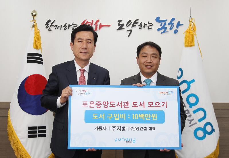 ㈜남광건설 주지홍 대표가 지난 5일부터 시범운영에 들어간 포은중앙도서관에 도서구입비 1천만원을 쾌척했다. 주지홍 대표는 6일 포항시청을 방문해 개관을 앞둔 포은중앙도서관이 시민들의 문화공간으로 자리매김하는데 보탬이 될 수 있도록 도서구입비 1천만원을 전달했다. 이강덕 포항시장은 “주 대표의 포항을 사랑하고 시민들을 위하는 마음이 도서관의 장서를 통해 시민들에게 온전히 전해질 것”이라며 감사의 뜻을 전했다. 한편 주지홍 대표는 포항고와 경희대 경영학과를 졸업하고 제58대 한국청년회의소 중앙회장을 역임했으며, 현재 명제산업과 남광건설, 광명아스콘 등을 경영하고 있다.// 심후보 기자